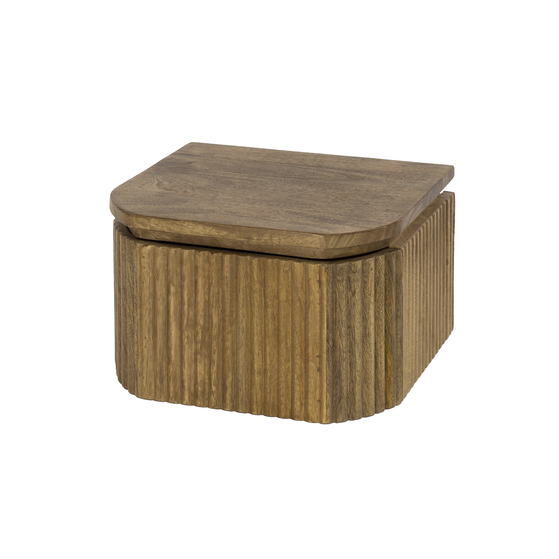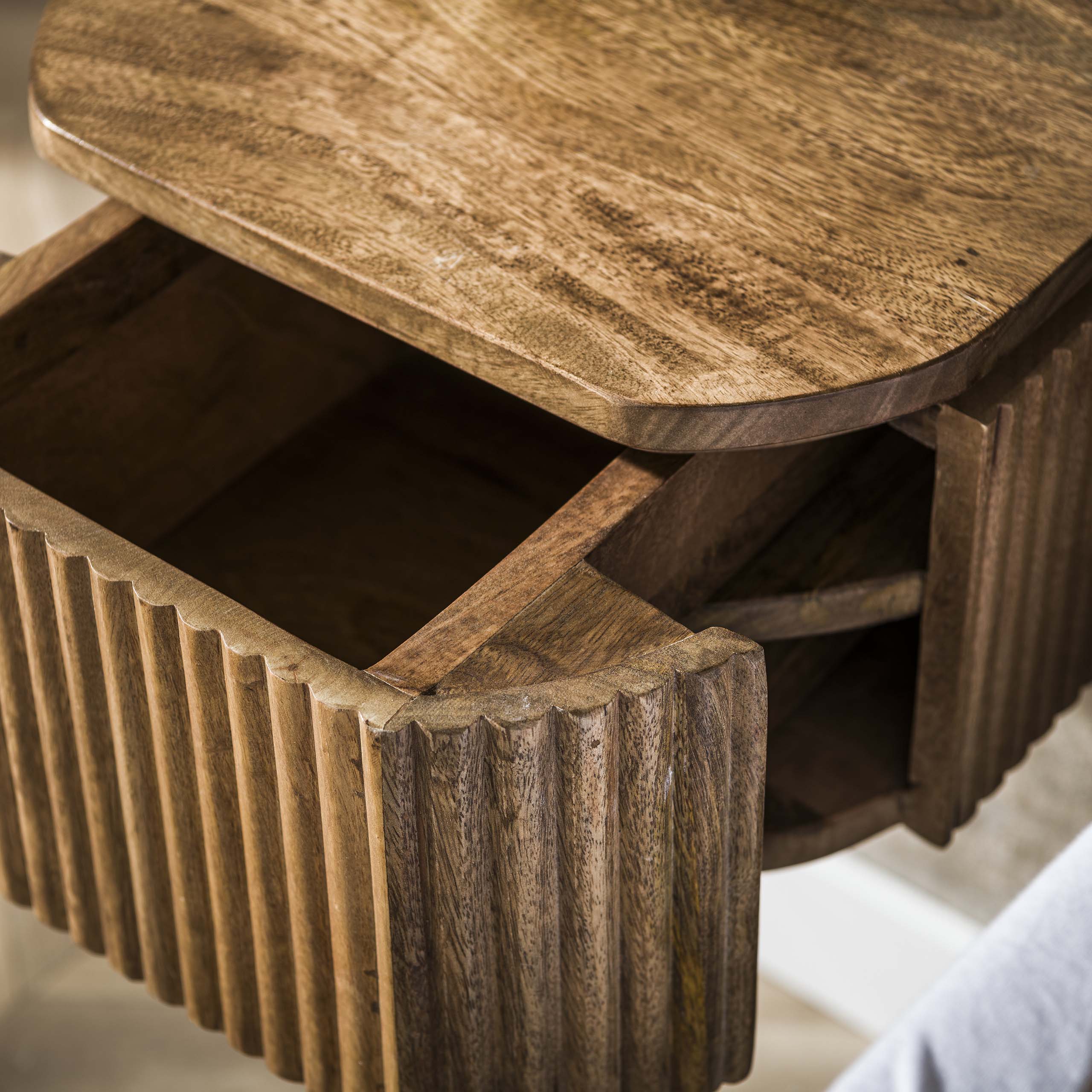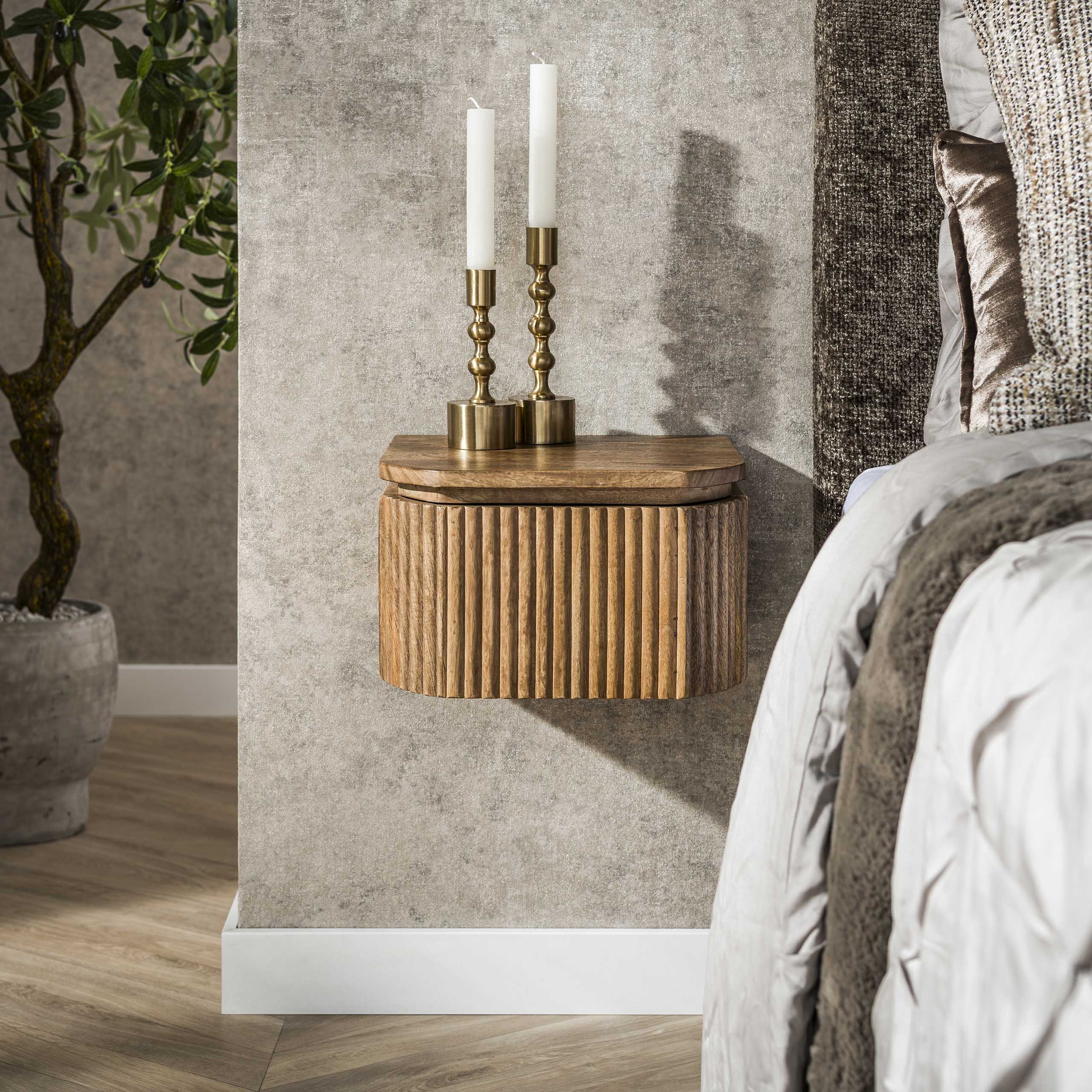 Nachtkastje Bas is een compact, wandgemonteerd nachtkastje van massief mangohout met een zandkleurige afwerking. Het wordt bevestigd met een stevige metalen strip met schroefgaten, waardoor het kastje zwevend lijkt en de vloer vrij blijft voor een ruimtelijke uitstraling. De lade heeft een verticaal golfpatroon dat structuur toevoegt en het ontwerp een luxe, moderne uitstraling geeft. Het kleine formaat maakt dit model geschikt voor slaapkamers waar weinig ruimte beschikbaar is of waar een subtiele, rustige look gewenst is.