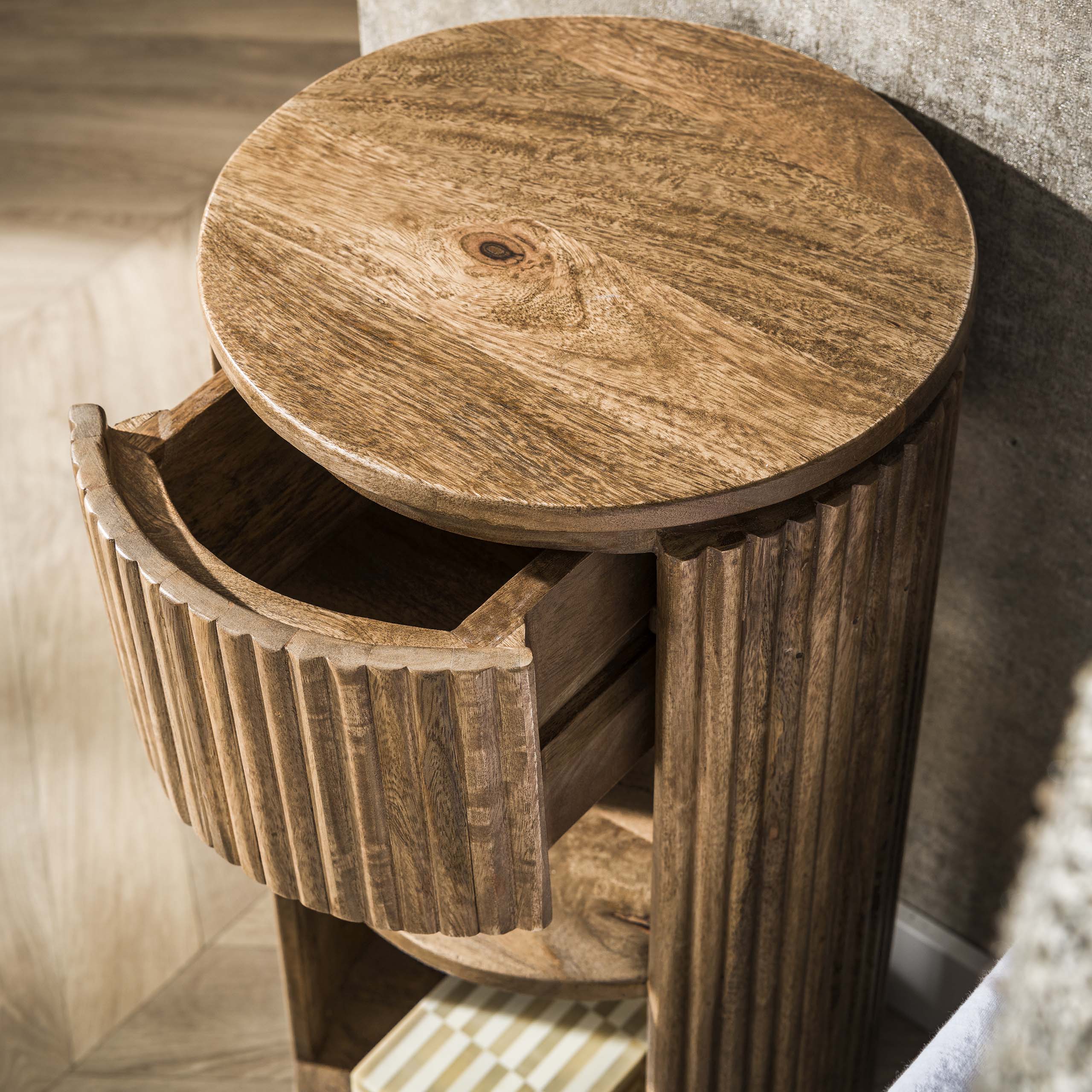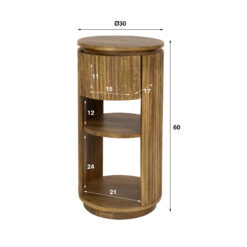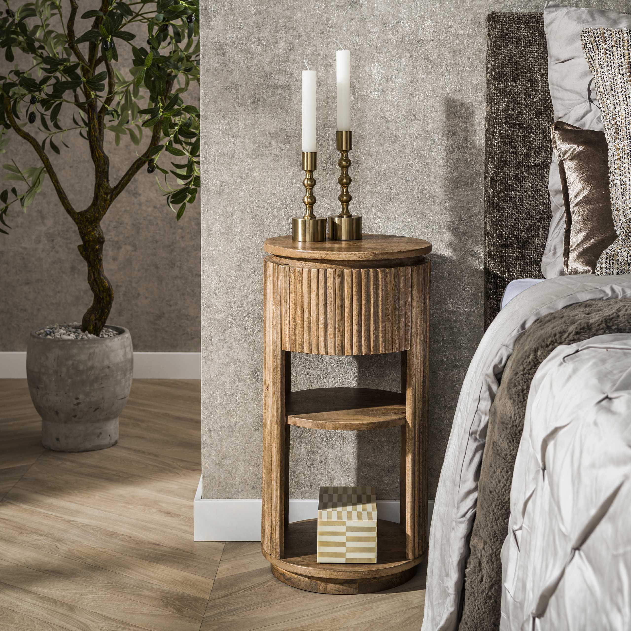 Nachtkastje Bas staand is een natuurlijk vormgegeven nachtkastje dat direct op de vloer staat en dus geen wandmontage nodig heeft. Het is gemaakt van massief mangohout met een zandkleurige matte afwerking en heeft een subtiel verticaal golfpatroon rondom het ontwerp. Het kastje heeft één lade en een open vak, waardoor je zowel decoratieve items zichtbaar kunt plaatsen als spullen kunt opbergen die je liever uit het zicht houdt. Dankzij de slanke afmetingen past het goed naast diverse bedformaten en is het geschikt voor zowel compacte slaapkamers als grotere ruimtes.