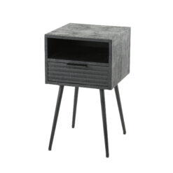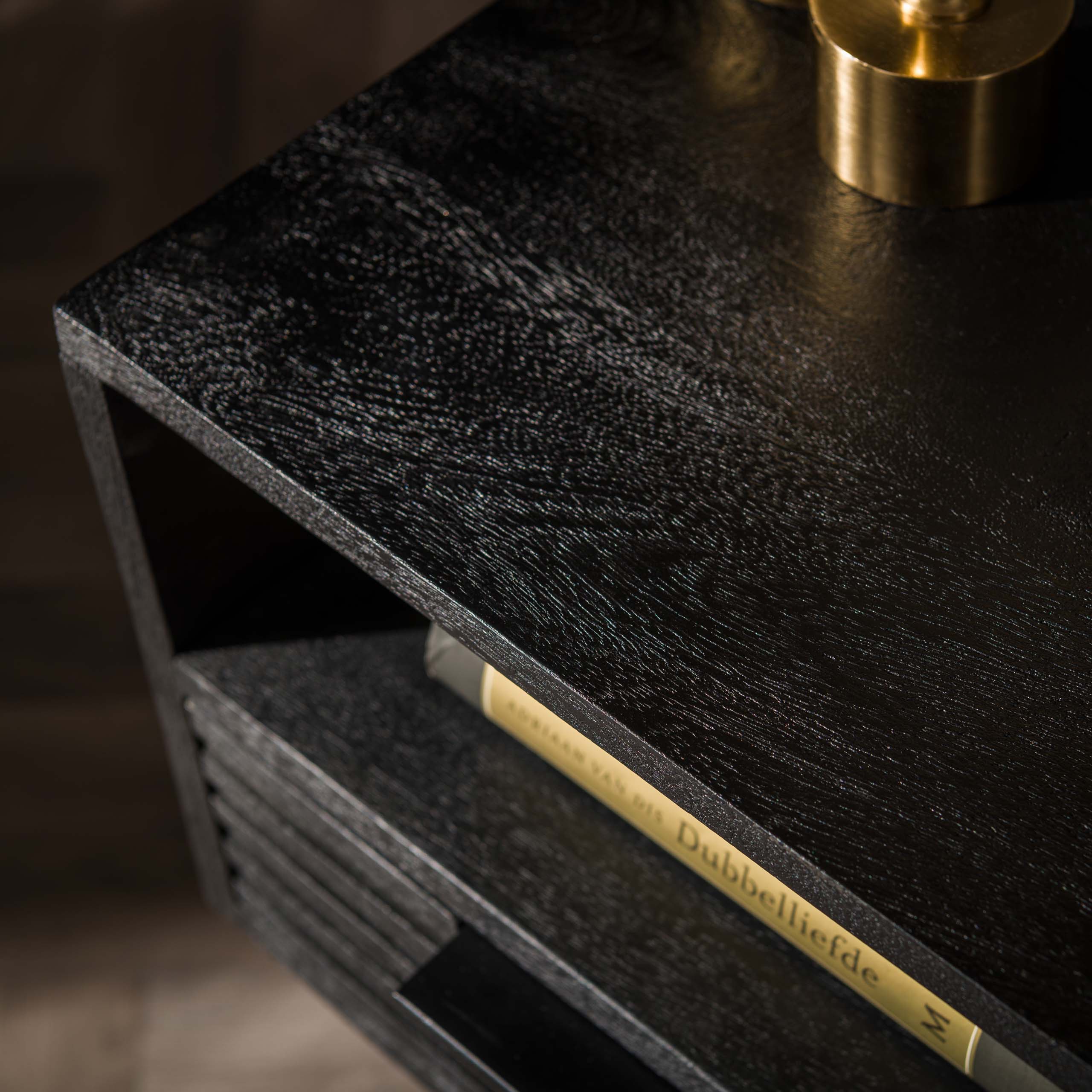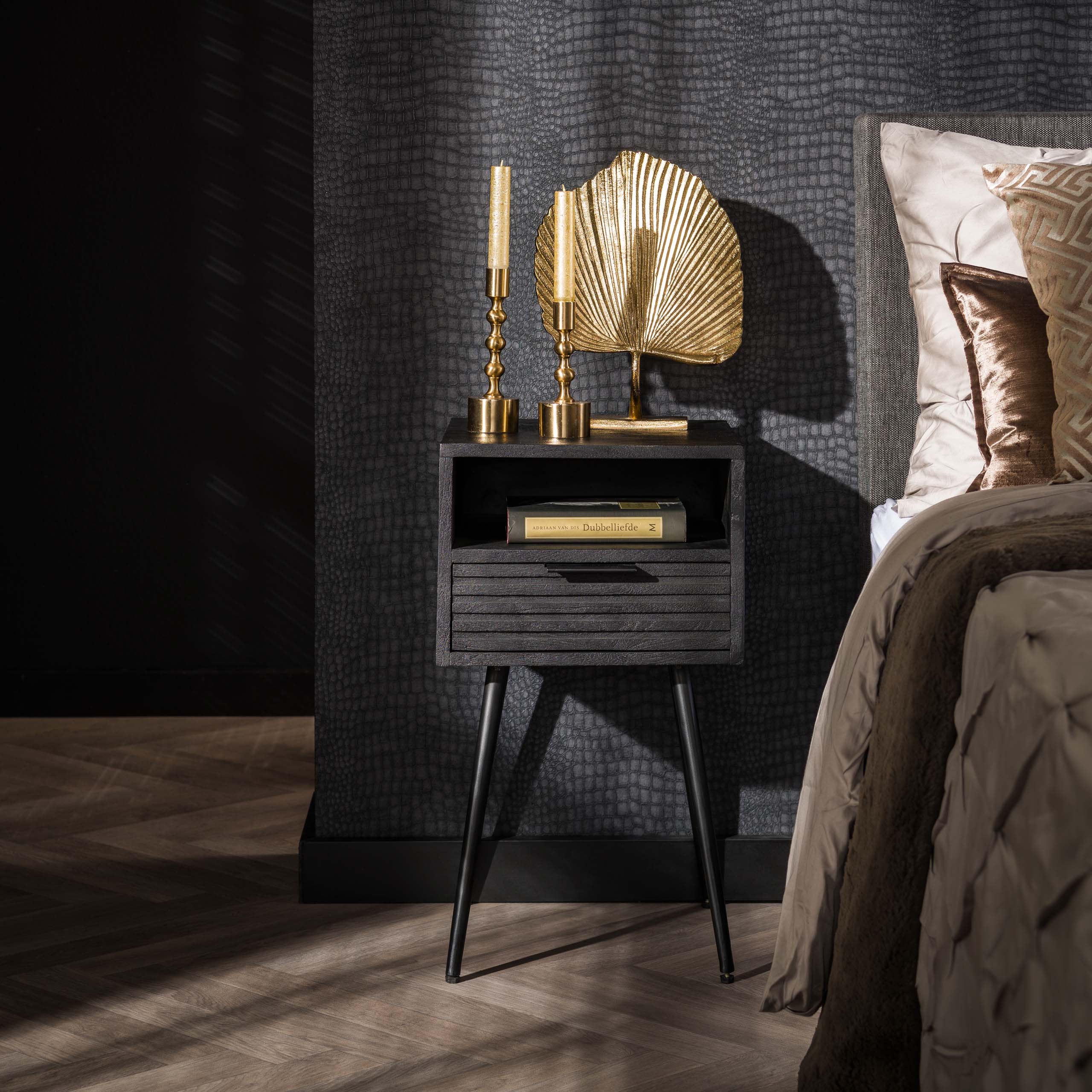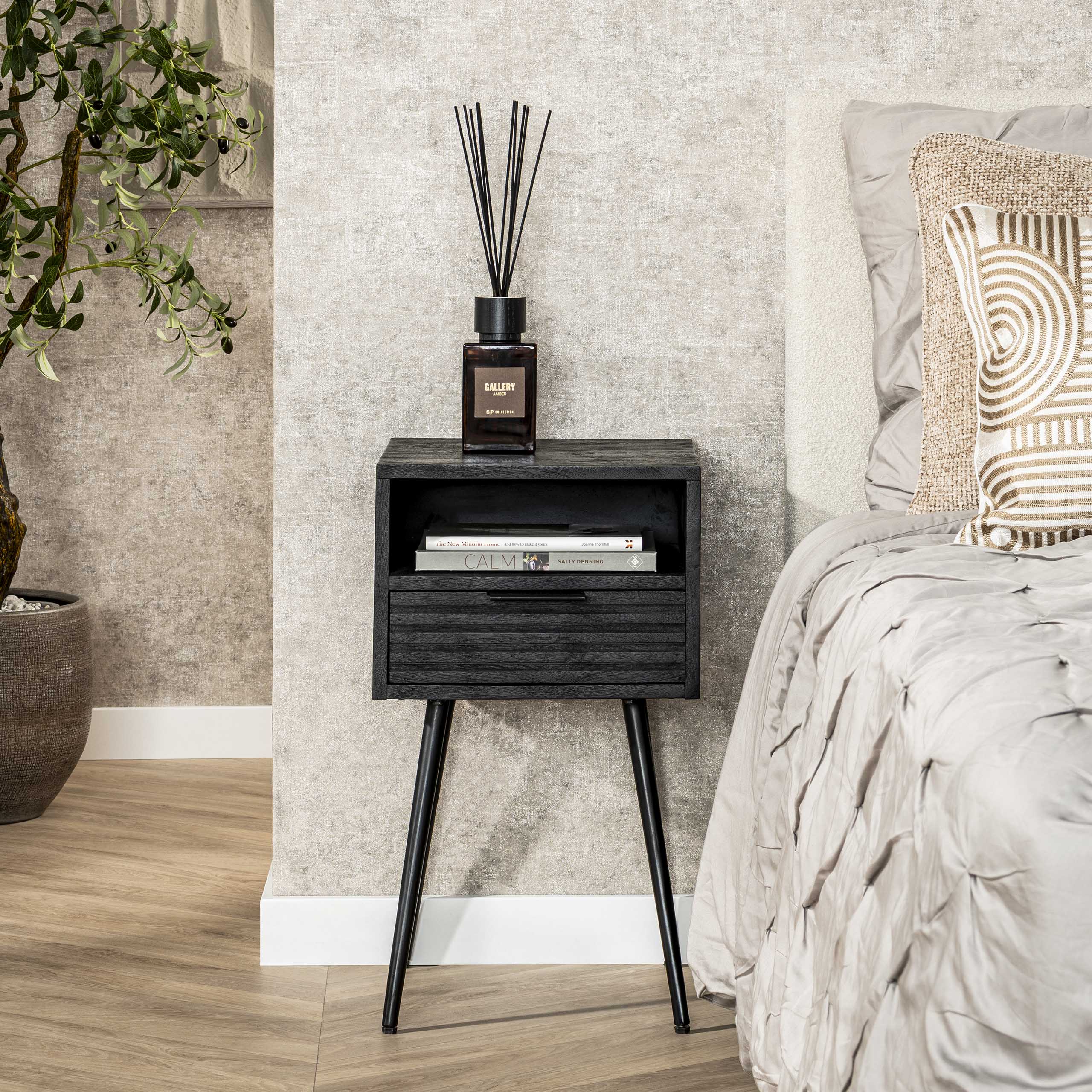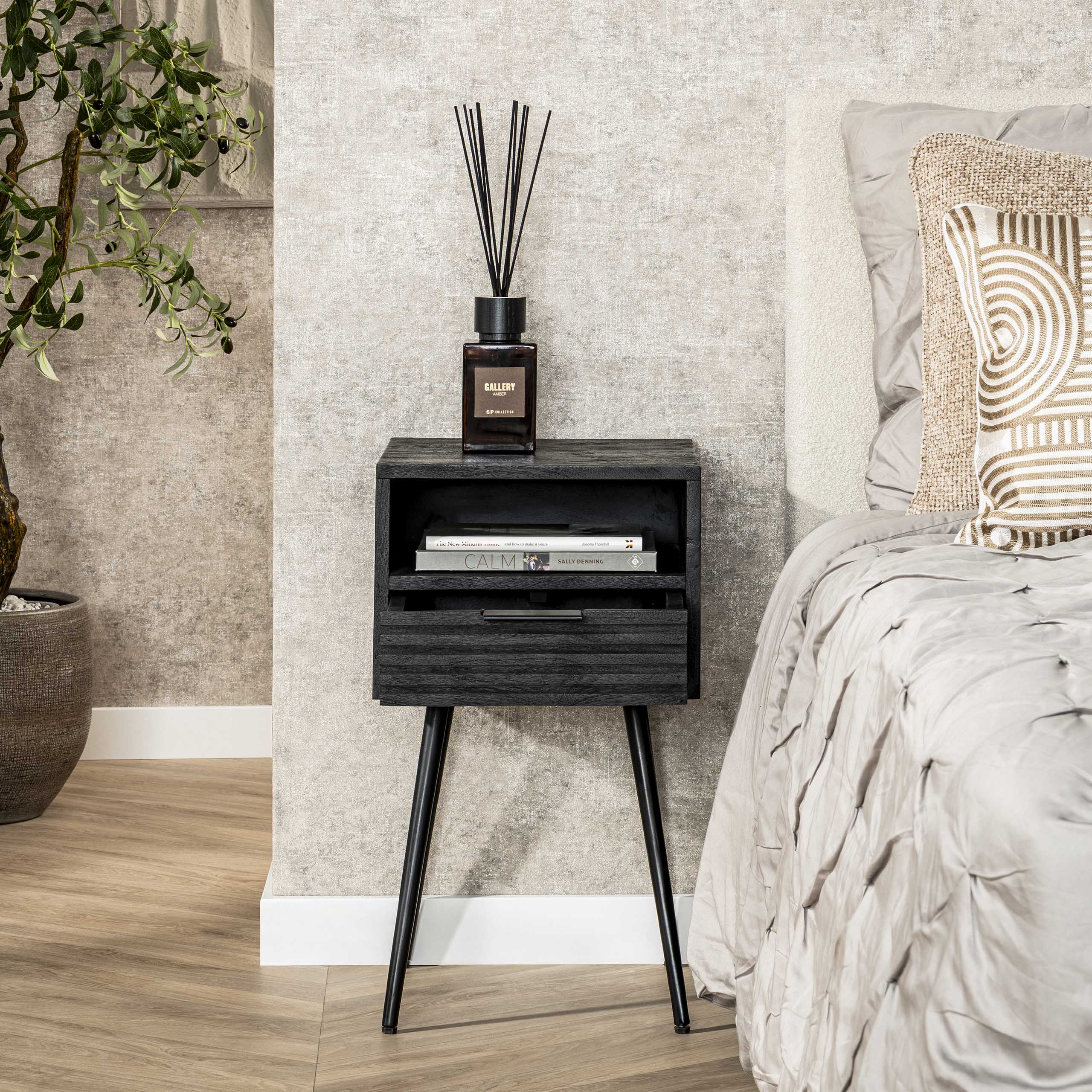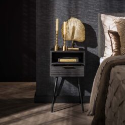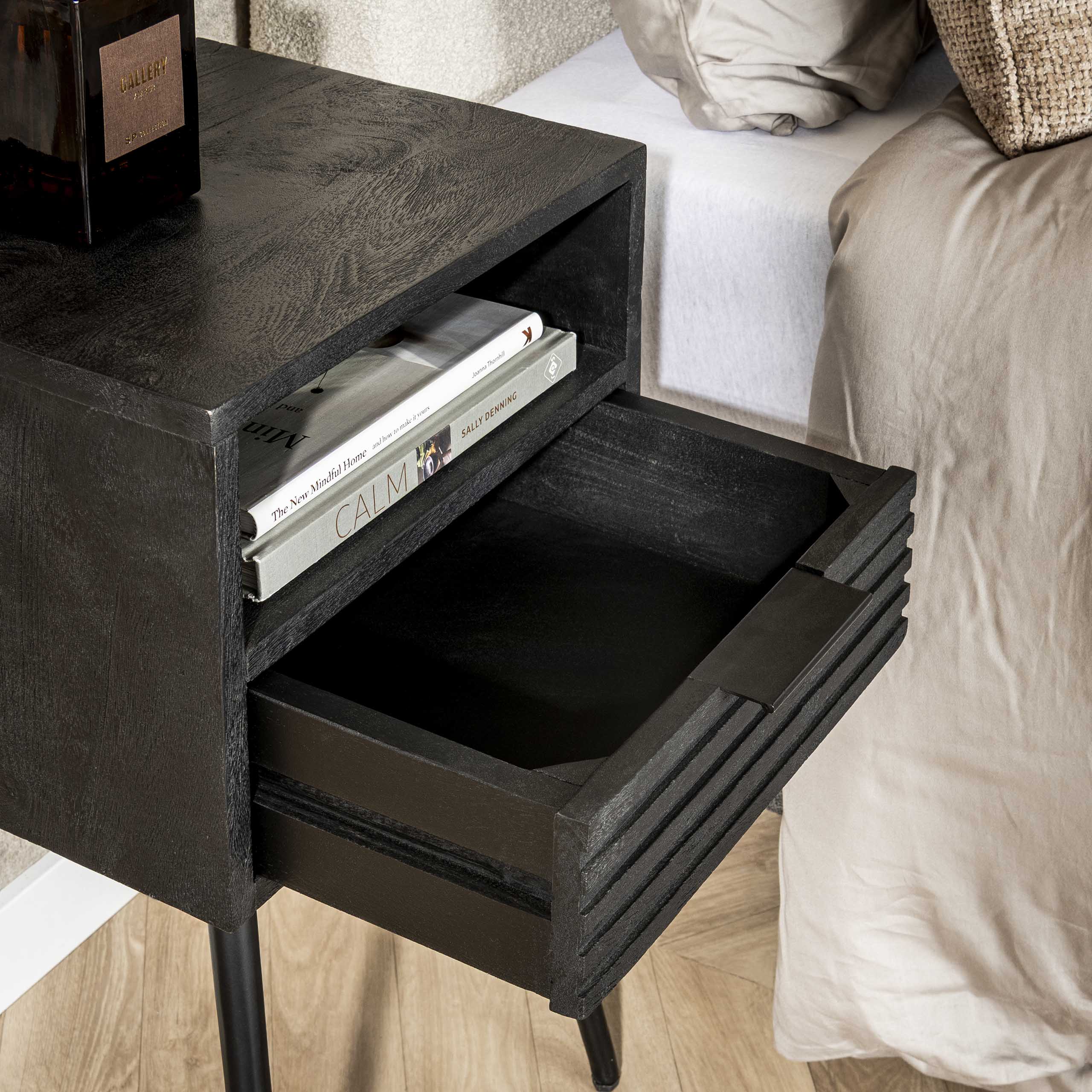 Nachtkastje Joe is een staand model dat direct op de vloer staat dankzij metalen poten, waardoor wandmontage niet nodig is. Het kastje is gemaakt van mangohout met een diepe, donkerzwarte afwerking en heeft een strak, glad geschuurd oppervlak waarbij de houtnerf subtiel zichtbaar blijft. Joe heeft één lade voor opbergruimte en een open vak waarin boeken, accessoires of nachtlampjes een plek kunnen krijgen. Het compacte formaat en rechte lijnen maken dit model geschikt voor uiteenlopende slaapkameropstellingen.