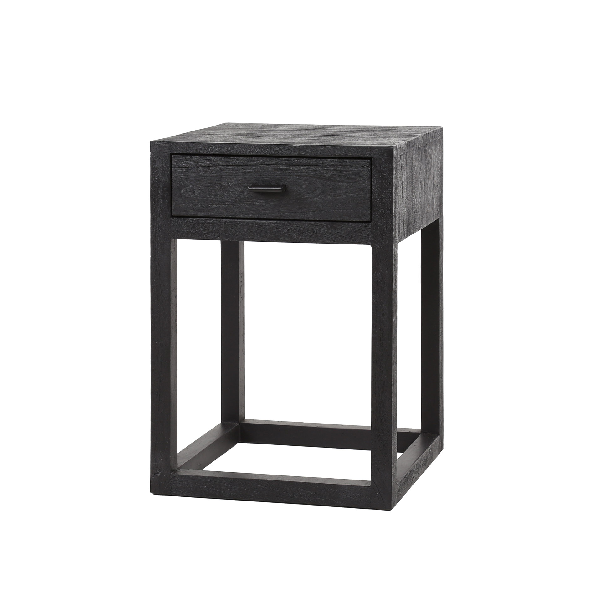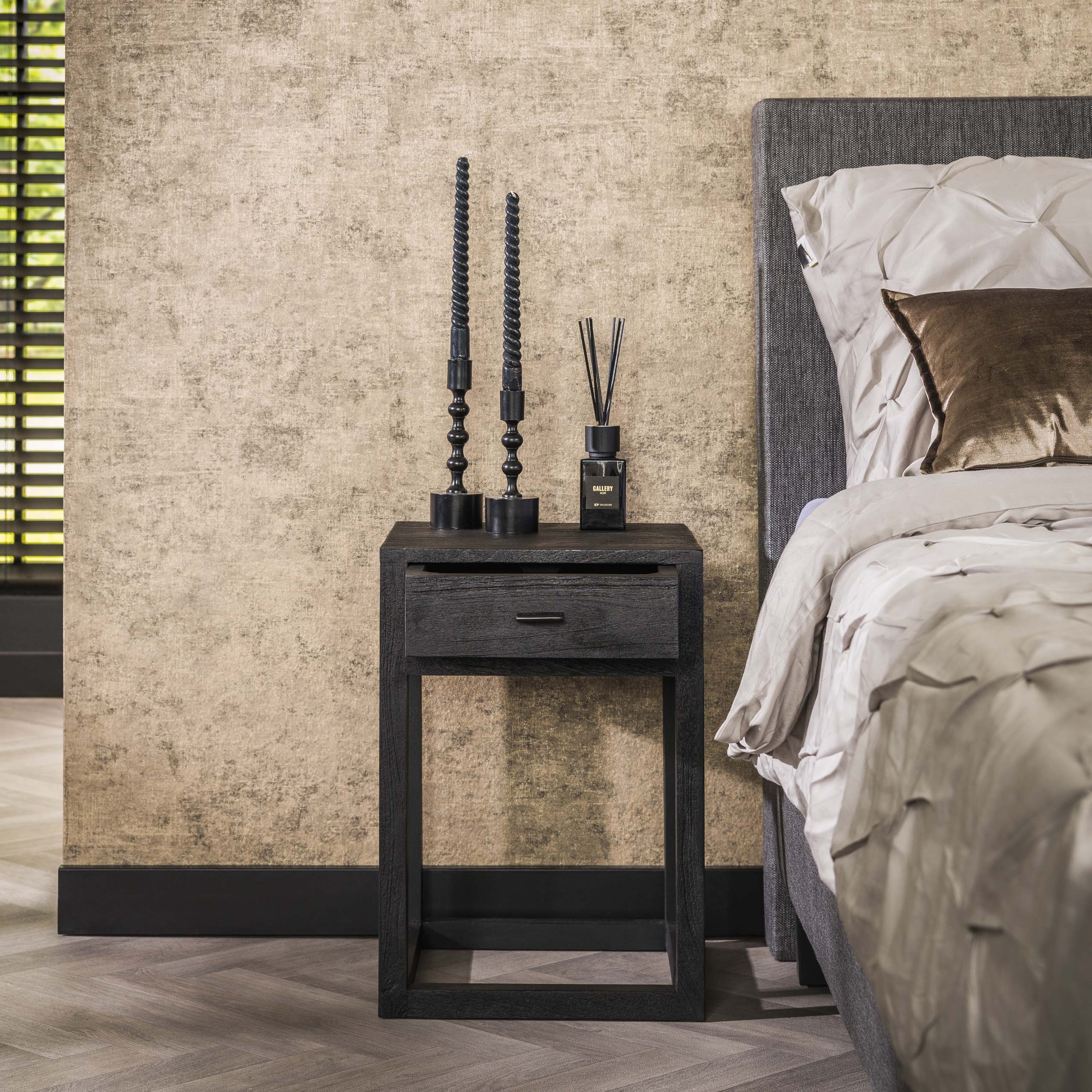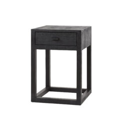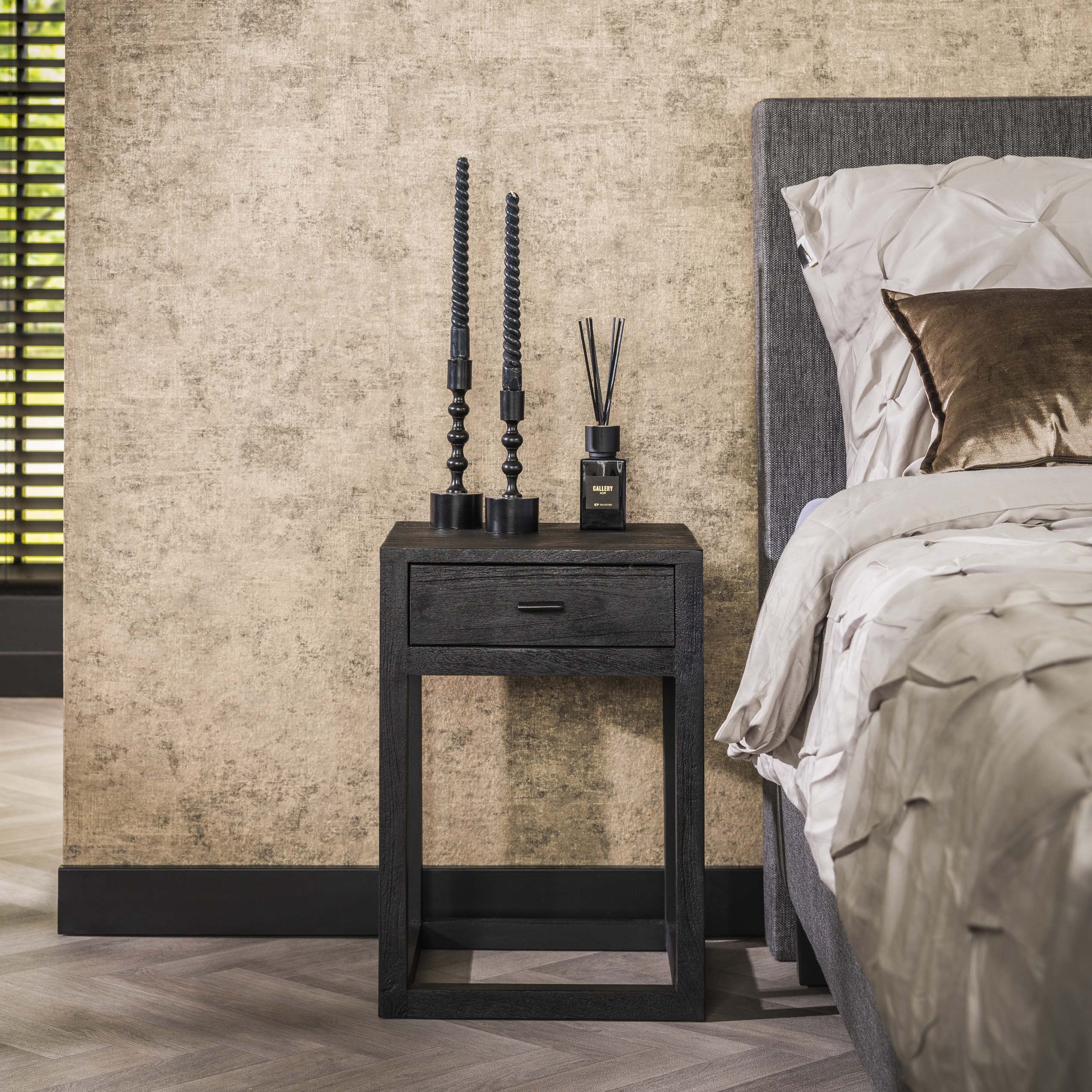 Nachtkastje Mark is een staand model van mangohout met een diepe zwarte afwerking. Het staat op een houten frame in plaats van metaal, waardoor het geheel een rustigere en meer natuurlijke uitstraling heeft dan veel industriële varianten. Het hout is glad geschuurd waardoor het oppervlak strak en vlak oogt, terwijl de houtstructuur toch zichtbaar blijft. De lade biedt opbergruimte voor dagelijkse items, terwijl het compacte ontwerp geschikt is voor zowel smalle als brede slaapkameropstellingen.