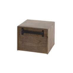 Deze variant van Nachtkastje Maud is een zwevend model dat met twee schroeven aan de wand wordt bevestigd, waardoor de vloer vrij blijft en de slaapkamer een luchtige uitstraling krijgt. Het kastje is gemaakt van massief acaciahout in een warme drift-brown eikenkleur en combineert een gesloten lade met een open vak. Dit maakt het ideaal voor wie zowel opbergruimte als stylingruimte zoekt, bijvoorbeeld voor boeken, een diffuser of een kleine plant.