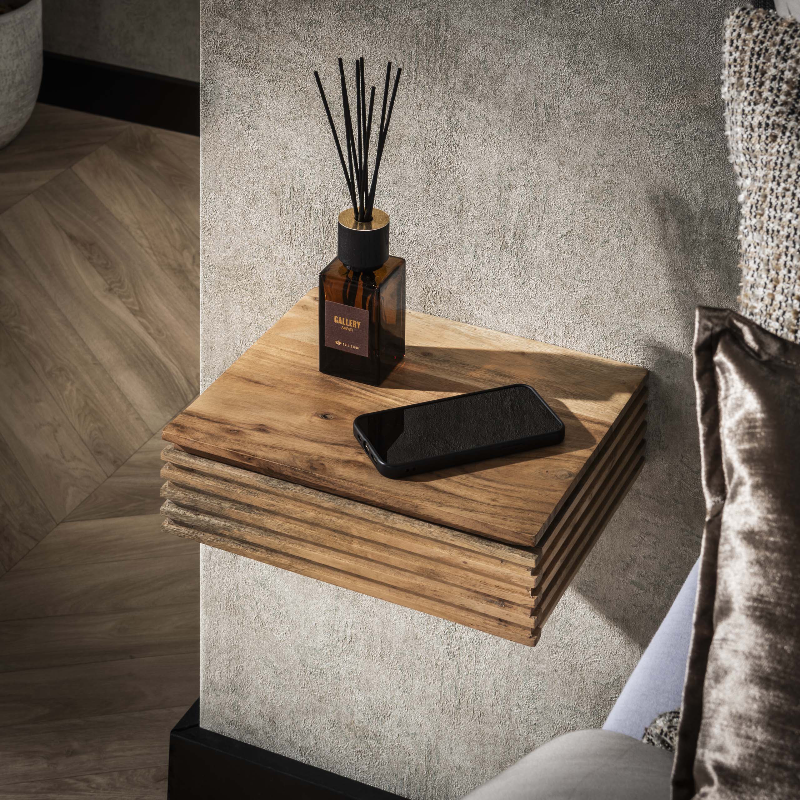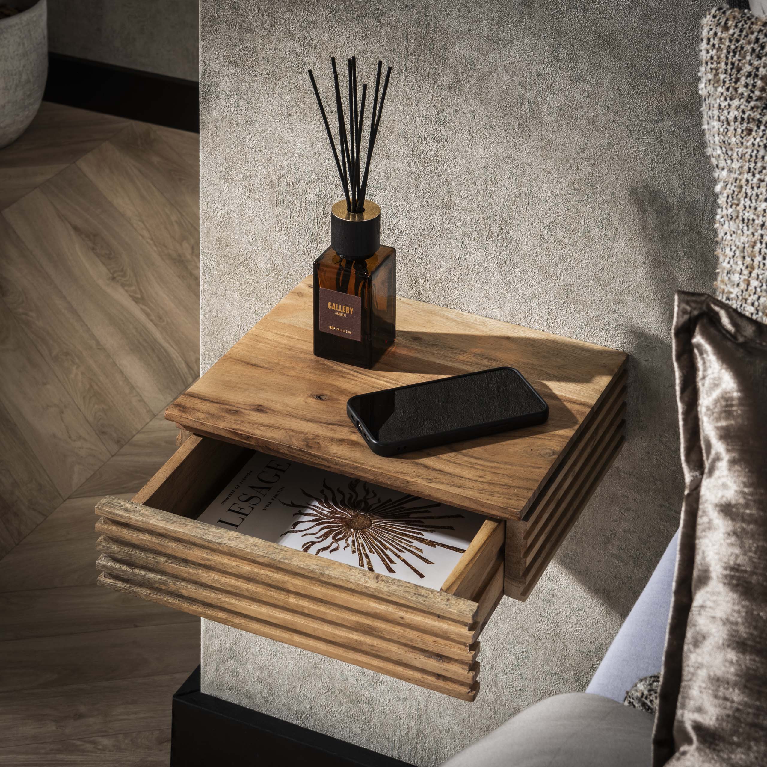 De Willard set bestaat uit twee zwevende nachtkastjes gemaakt van acaciahout, afgewerkt met een matte transparante lak in een warme eikenkleur. Beide kastjes worden aan de wand bevestigd met schroeven, waardoor de vloer vrij blijft en de ruimte optisch groter oogt. Door het compacte ontwerp en het subtiele wave-patroon krijgen de kastjes een stijlvolle, rustige uitstraling. De lade biedt opbergruimte voor kleine items, terwijl het zwevende ontwerp zorgt voor een opgeruimd en luchtig geheel.